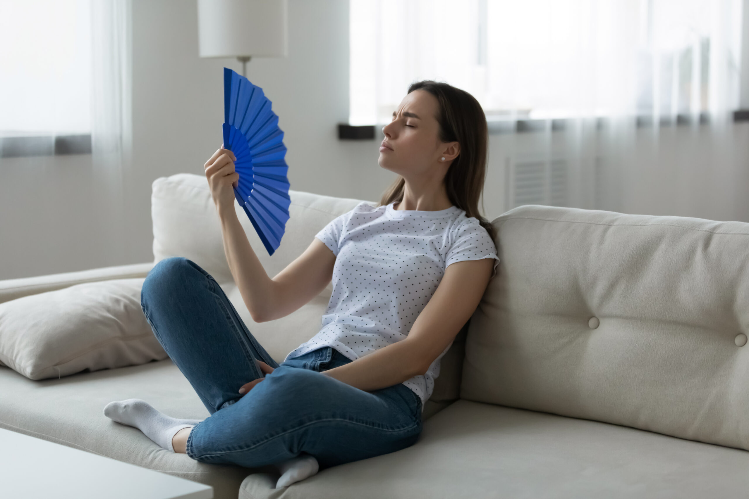 Woman wear casual clothes sitting resting on couch in living room suffers from unbearable hot summer day weather waving hand blue fan reduces heat cooling herself. Home without air conditioner concept